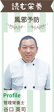 寒い季節となり、コロナやインフルエンザにかかる人が増えています。こんな時こそ、栄養をしっかり摂り、風邪に負けない体づくりを心がけましょう。ビタミンA は、粘膜や皮膚を健康に保ち、鼻や喉を守ることでウイルスの侵入を防ぎます。免疫機能を高める働きもあり、レバー、卵黄、乳製品、緑黄色野菜(にんじん、かぼちゃ、ほうれん草など)に多く含まれます。