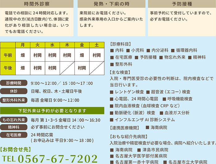 発熱・頭痛・腹痛など体の不調への対応を通して、健康寿命の延長を目指します。